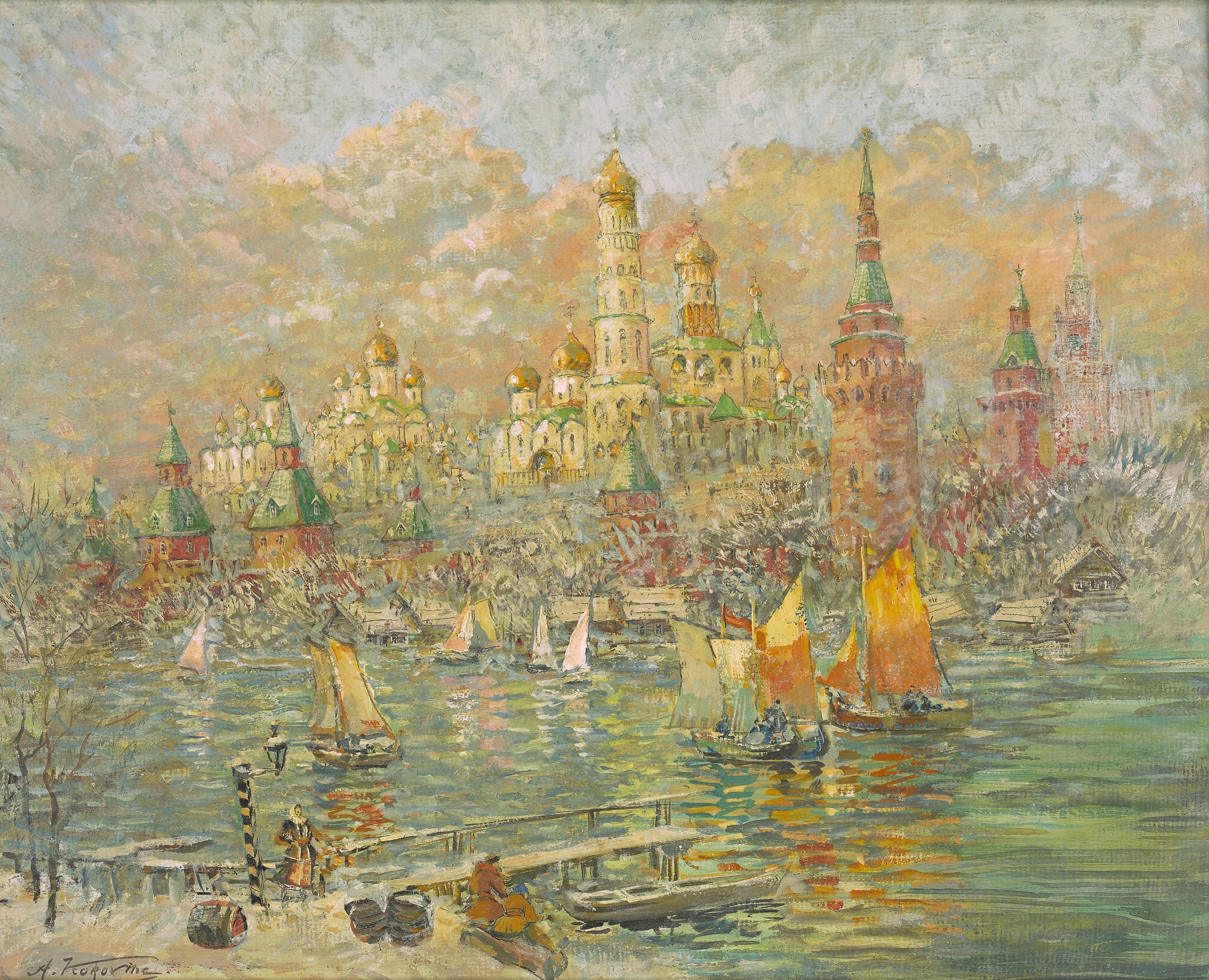 «По всей Красной площади в Москве раскинуты палатки вербного базара. Блистают на весеннем солнце золотые купола кремлевский соборов. За храмом Василия Блаженного видна голубая даль, и радостно сияют воды Москва-реки. Она широко разливается по лугам, заманчиво розовеют дали оголенных весенних лесов. У торговых рядов и памятника «Минина Пожарного» стоят рядами пролетки извозчиков и частных экипажей. Народу – не протолпишься. Пеструю толпу освещает весеннее солнце. После долгой суровой зимы вербный базар – какой-то особый праздник Москвы. Веселый базар. Товары кустарей, любителей в бесчисленном разнообразии», – так описывал Москву в своем авторском рассказе «Вербное воскресенье» первый русский импрессионист Константин Коровин, вторя своим энергичным и радостным живописным образам. Его сын Алексей продолжил дело отца. Импрессионизм для них был способом заработка в Париже и отрадой бытия, оба художника тяжело переживали удручающее состояние здоровья Алексея. Представленная картина – суть идеализированный образ Московского Кремля, созданный Коровиным младшим в эмиграции в Париже.