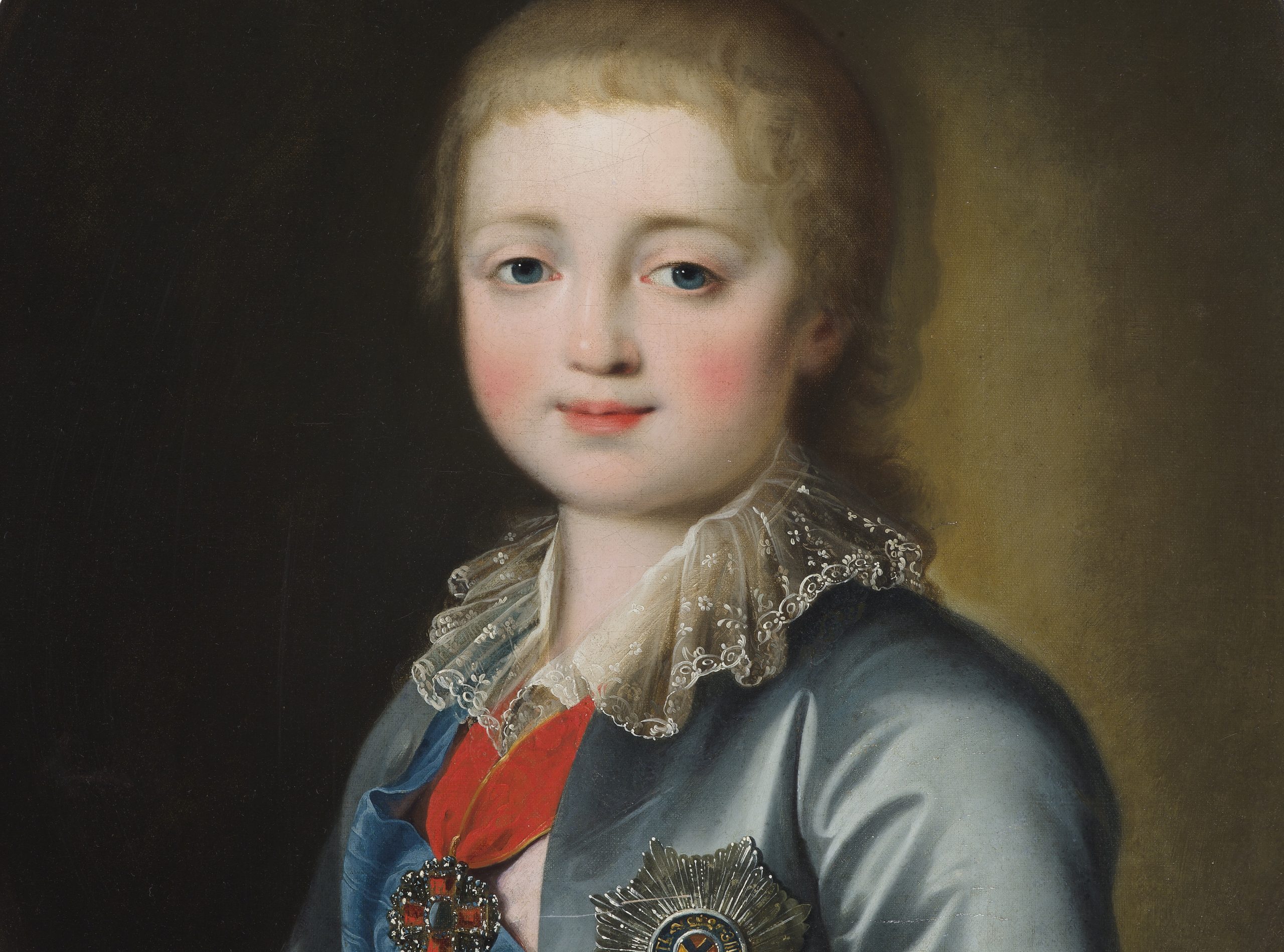 На портрете Константин, младший брат Александра I и сын Павла I, написан в возрасте 7 лет. Екатерина Великая, принимавшая активнейшее участие в воспитании внуков, назвала Константина в честь Константина Великого – Римского императора, сделавшего христианство господствующей религией империи и перенесшего столицу в Константинополь. Александра она назвала в честь Александра Невского. Екатерина надеялась, что Константин освободит Константинополь от турок, а Александр станет государем вновь восставшей из пепла Византийской империи. Однако планы императрицы не были осуществлены. В междуцарствии 1825 года Константин Павлович около 25 дней считался наследником престола, однако, отрекся от власти по собственному желанию еще в 1823 году, поскольку был женат на польской графине, а такой брак не считался равным. Наследником престола стал третий сын Павла I Николай I. На портрете на Константине – голубая лента ордена Святого апостола Андрея Первозванного, а также орден Святой Анны 1-ой степени.